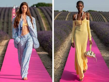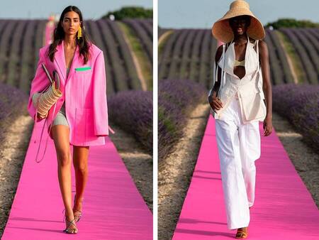 История современного визуального языка Jacquemus в значительной степени начинается с показа «Le Coup de Soleil» в лавандовых полях Валансоль. Розовый подиум, протянувшийся через бесконечное фиолетовое поле, стал не просто подиумом — он превратился в символ эстетики бренда. Когда кадры с показа появились в Instagram, они быстро стали вирусными. Комбинация природного ландшафта и яркого искусственного элемента выглядела одновременно минималистично и смело. Модели шли по подиуму свободно, без намеренной театральности, будто были частью этого пейзажа. В этот момент стало очевидно: Jacquemus умеет превращать сам процесс показа в контент, работать с природой как с рекламным пространством, а с цветом — как с эмоциональным языком.