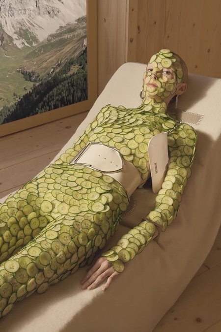 «Winter Retreat» стал примером того, как Jacquemus умеет работать с контрастами. Кампания построена вокруг образов модели Алекc Консани, появляющейся в неожиданных для люксового бренда сценах: она делает огуречную маску, сидит на тренажёре для гребли, выполняет обычные бытовые действия. Этот приём работает за счёт столкновения противоположностей — расслабленности и активности, красоты и повседневности. Кампания вызывает лёгкую улыбку, и в то же время сохраняет эстетическое качество бренда: чистые фоны, мягкий свет, минималистичная композиция остаются на месте.