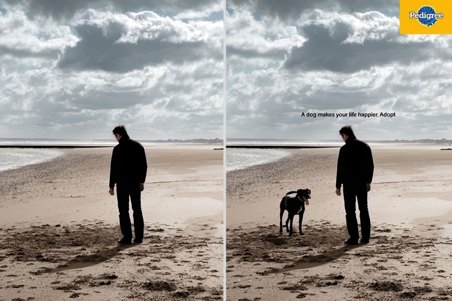 «A dog makes your life happier. Adopt.» («Собака делает твою жизнь счастливей. Возьми из приюта.»), агентство ALMAP BBDO для Pedigree, 2013