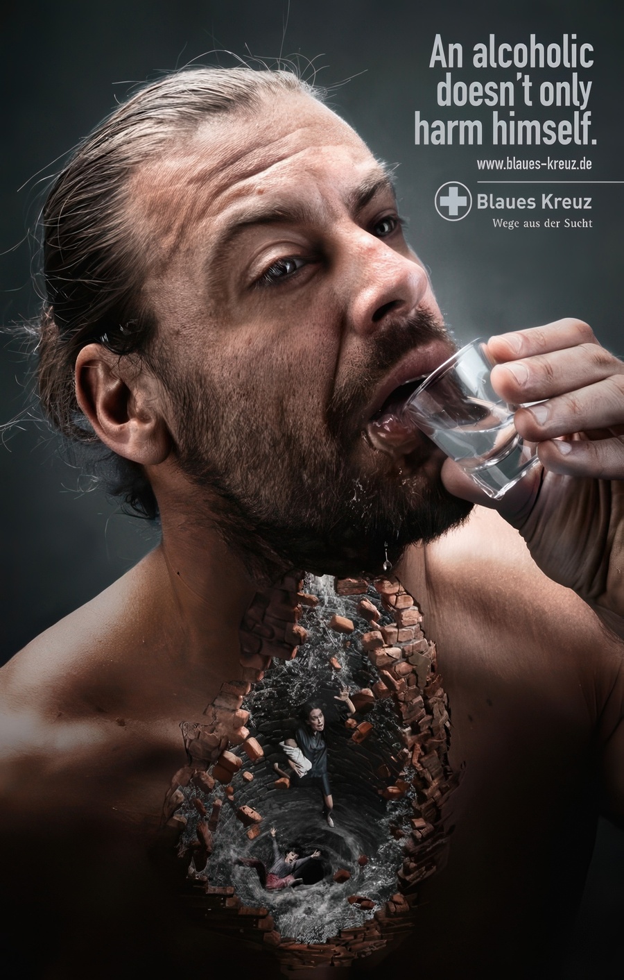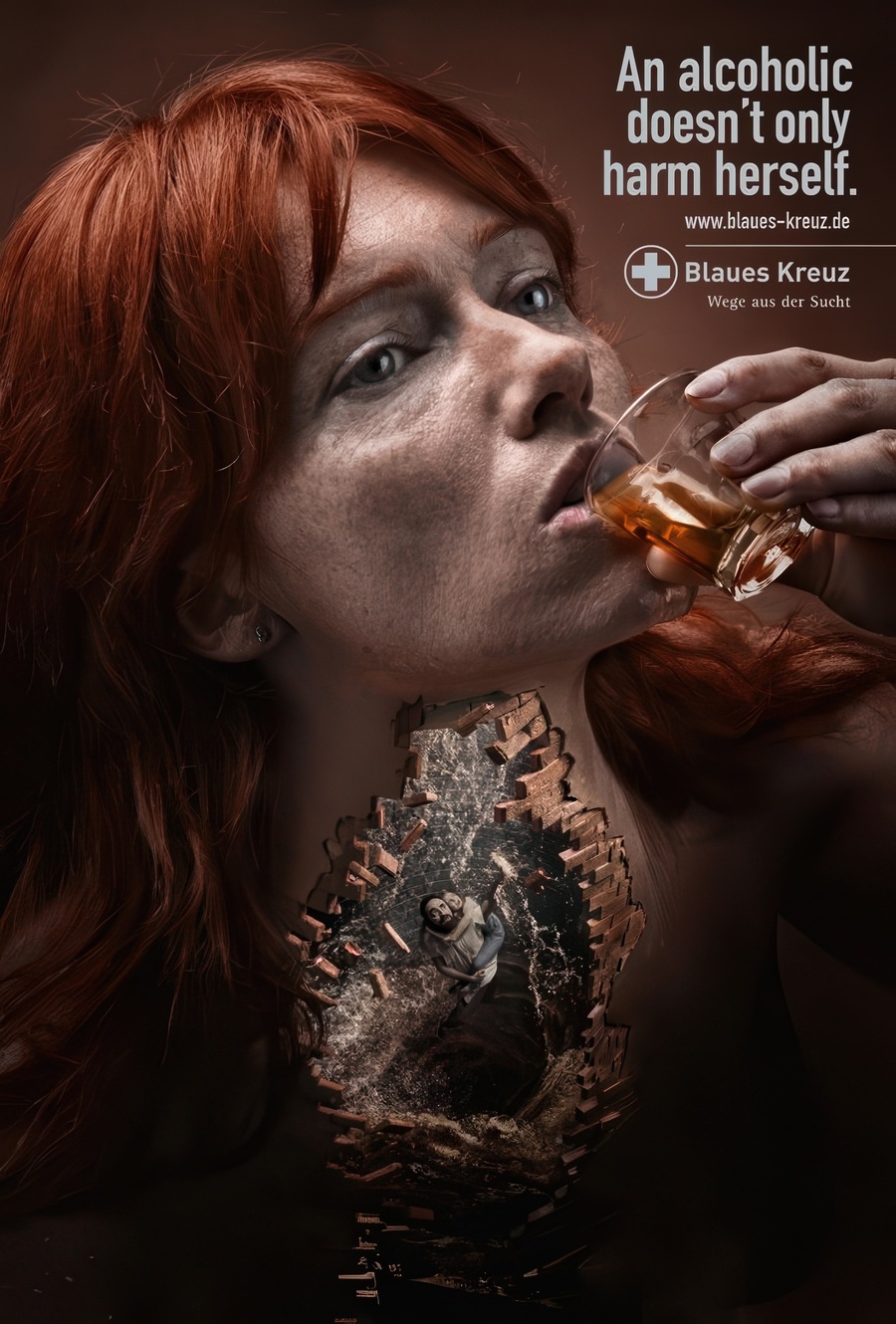 «An alcoholic doesn’t only harm herself» («Алкоголик калечит не только себя»), агентство BBDO для Blaues Kreuz, 2017