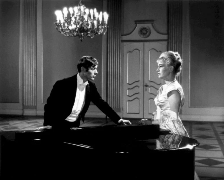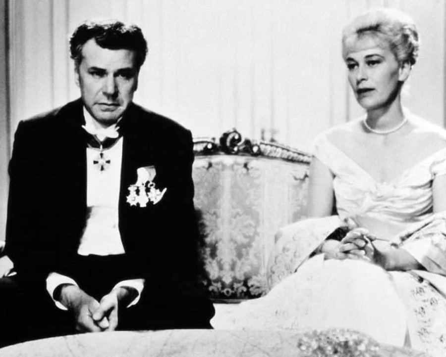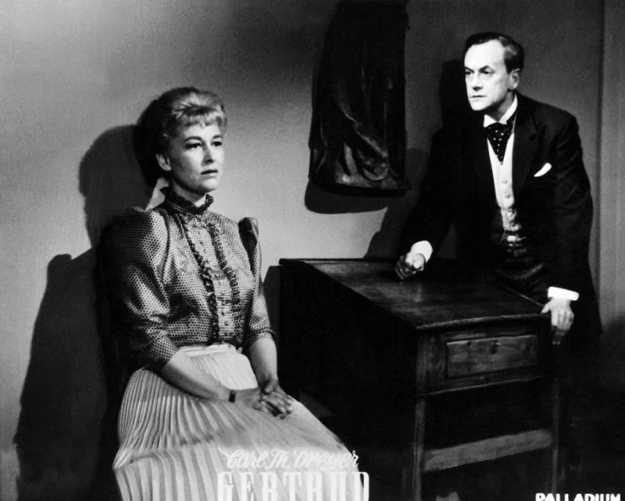 В сценах из фильма «Гертруда» (1964) Дрейер использует те же принципы мизансцены, что и в поздних работах: минимум предметов, статичность, продуманные позиции персонажей и акцент на внутреннем состоянии, выраженном не действием, а позой и пространственным решением кадра. Персонажи часто сидят или стоят почти неподвижно, расстояние между ними и их положение в комнате показывают эмоциональную дистанцию, конфликт, невозможность близости. Лица и жесты спокойны, но именно в этом спокойствии и читается напряжение — взгляд в сторону, выпрямленная спина, чуть закрытая поза рук иногда говорят больше, чем слова.