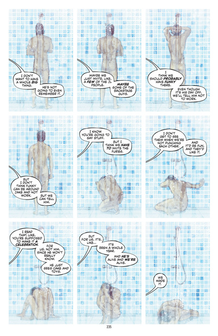 Весь комикс построен на основе девятипанельной сетки. Такая компоновка создает жесткий ритм, отражающий ощущение Скотта, что он находится в ловушке. Сетка регулирует время, каждый фрейм как удар метронома, который визуально усиливает монотонность жизни Скотта после его попытки самоубийства.