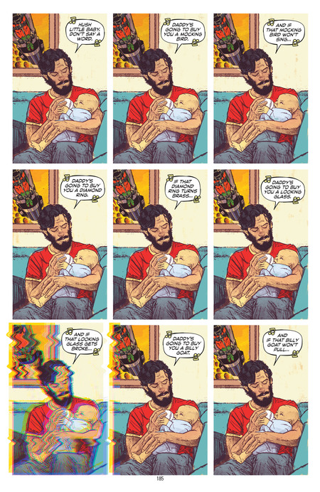 Важной визуальной техникой в комиксе является глитч-эффект. Искажения и цветовые сдвиги периодически вторгаются в изображения, что в первую очередь даёт нам понять, что состояние Скотта нестабильно. Эффект служит напоминанием о том, что-то, что мы видим, не всегда реально, и что сознание Скотта — как и изображение в комиксе — повреждено и подвержено искажениям.