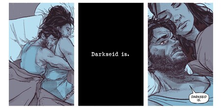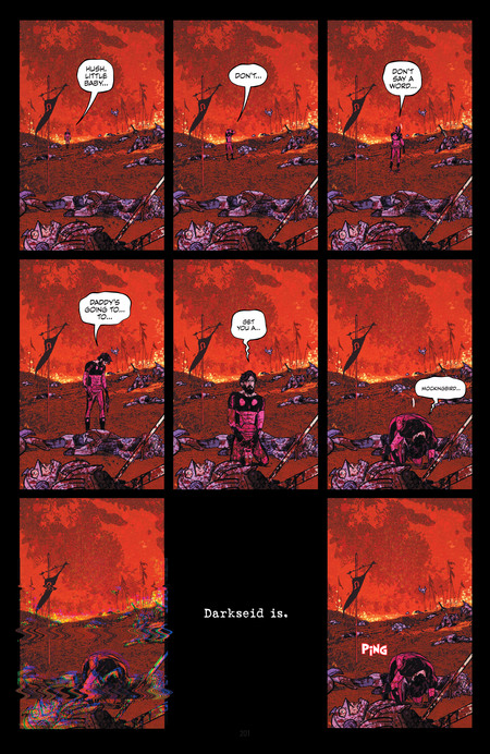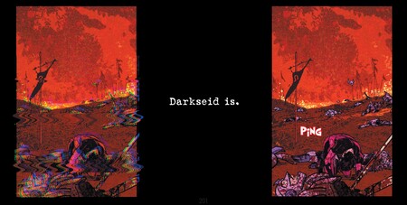Глитч-эффект также рифмуется с проходящим через весь комикс мотивом «Дарксайд есть.». Оба появляются без объяснений, вторгаясь в повествование, и показывают повреждённое сознание героя, не давая ему забыть. Оба мотива становятся визуальными эквивалентами навязчивой мысли — внезапной, иррациональной и неудержимой — усиливая чувство беспокойства читателя.