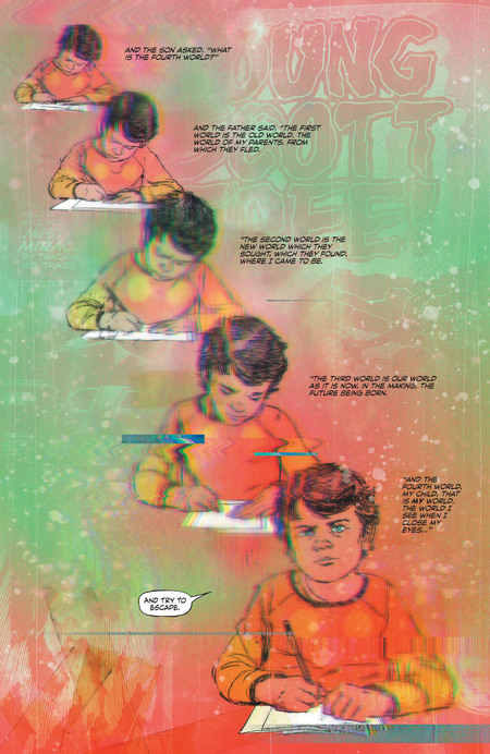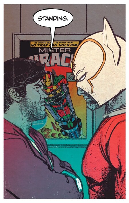 «Мистер Чудо» (2017–2019) Тома Кинга и Митча Герадса — это комикс, в котором мифология «Четвертого мира» Джека Кирби переосмыслена через призму современности. Серия рассказывает о Скотте Фри, супергерое и мастере побегов, которому приходится бороться с травмами, войной, при этом совмещая это с семейной жизнью.