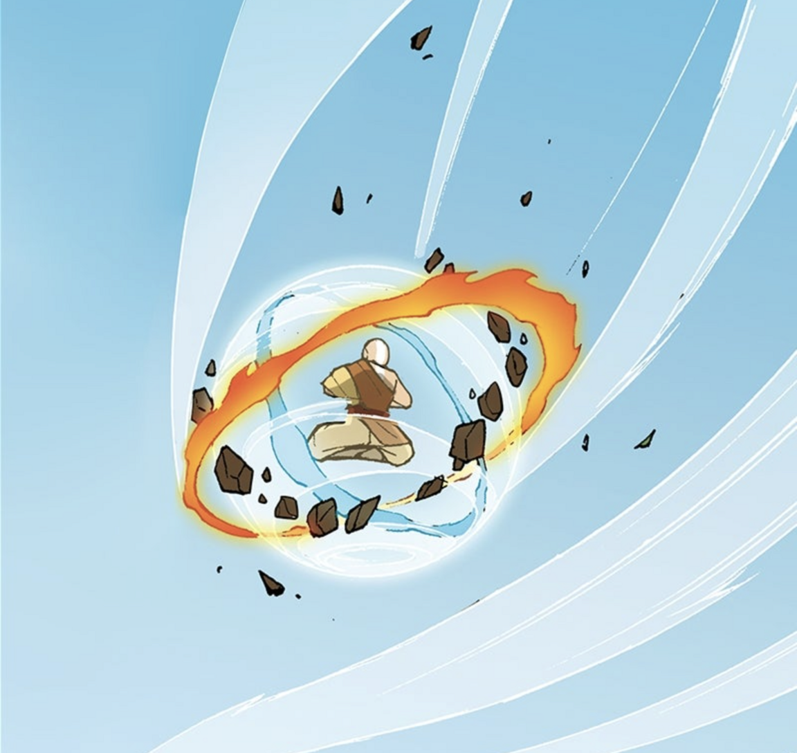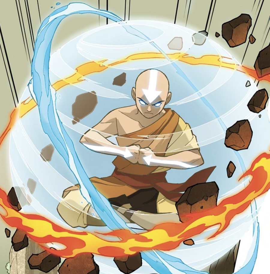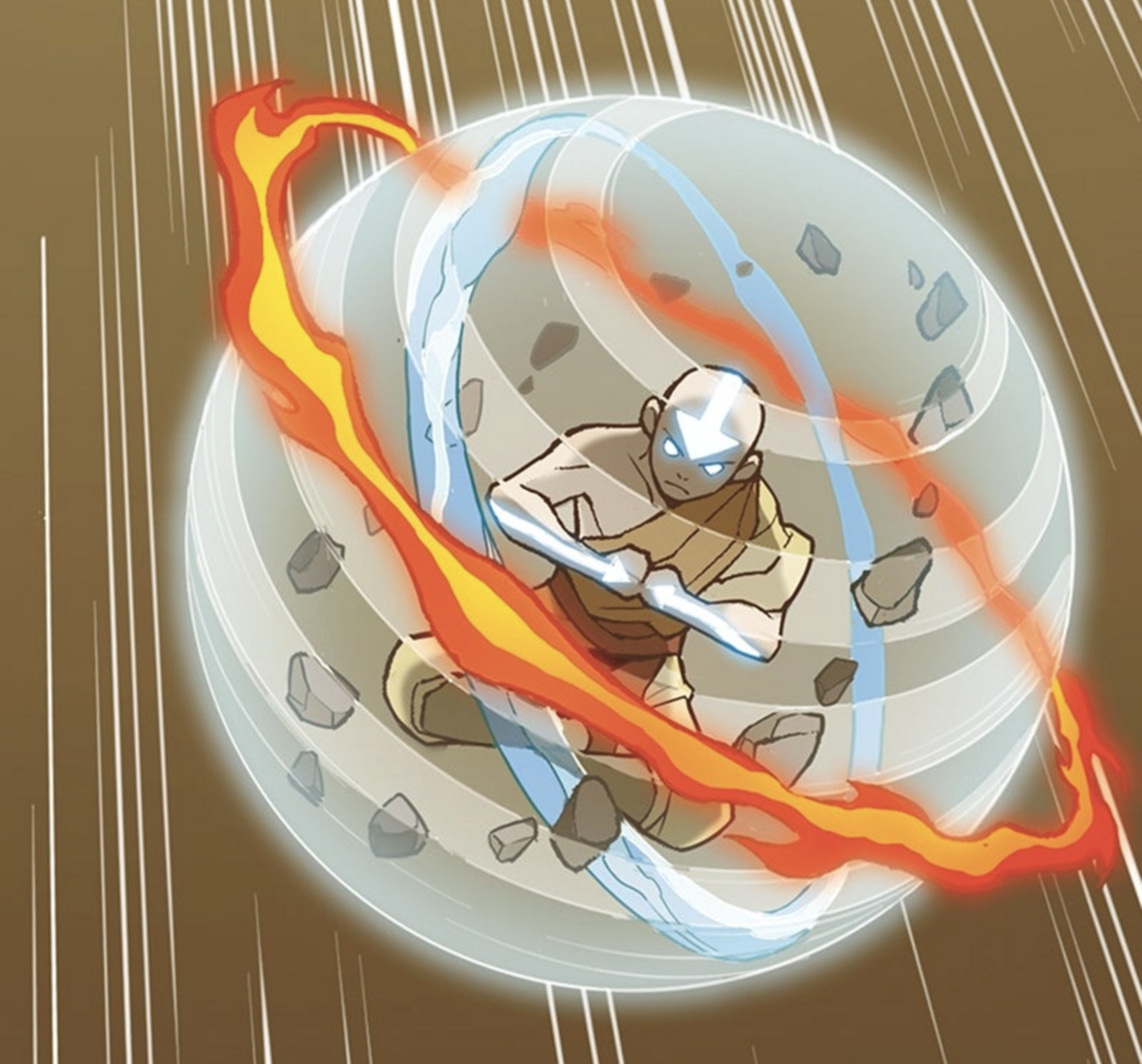 Также есть «полный» переход в состояние Аватара, когда Аанг овладевает всеми четырьмя стихиями, и теперь все элементы вращаются вокруг его воздушного круга, в котором он себя защищает во время этого состояния, это превращает обычного мальчика в величественного и непобедимого мага.