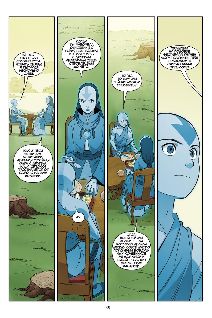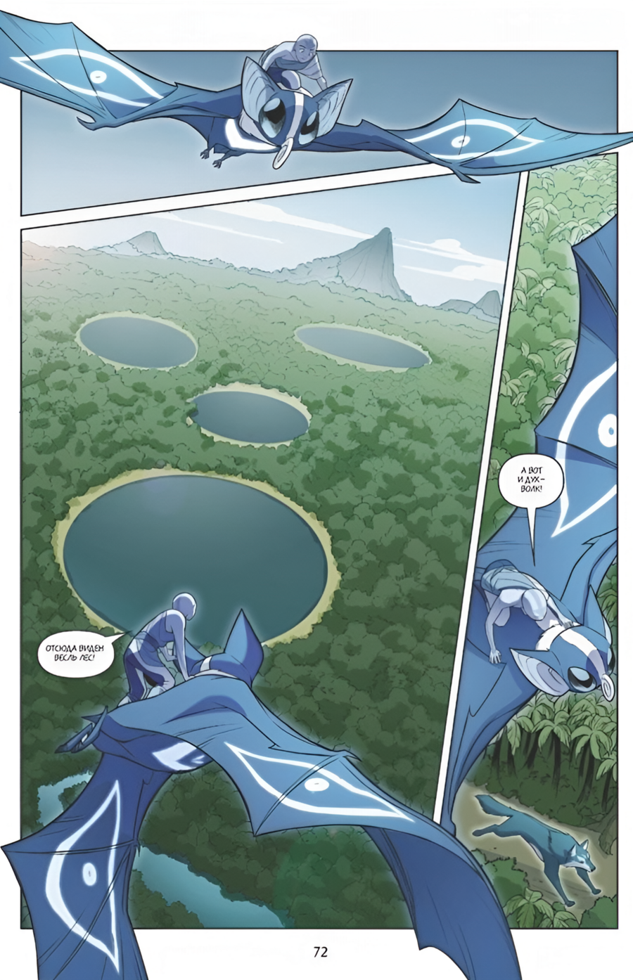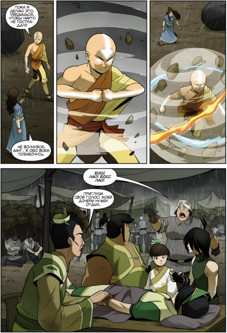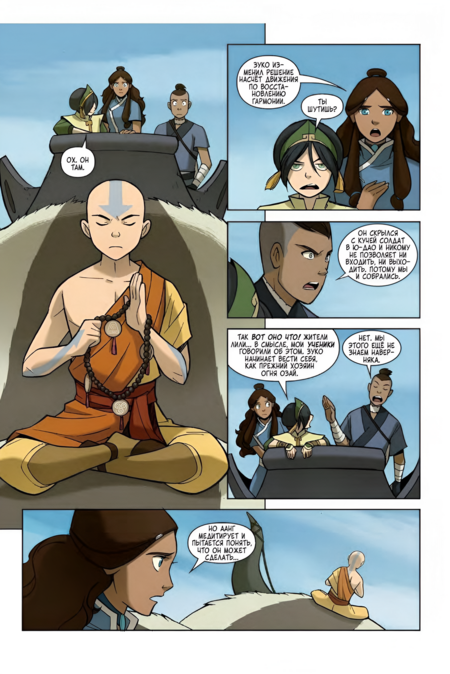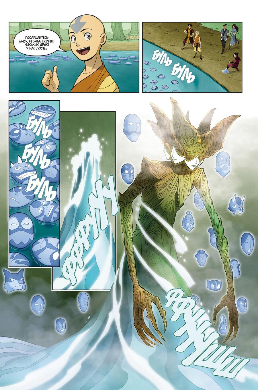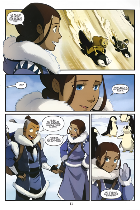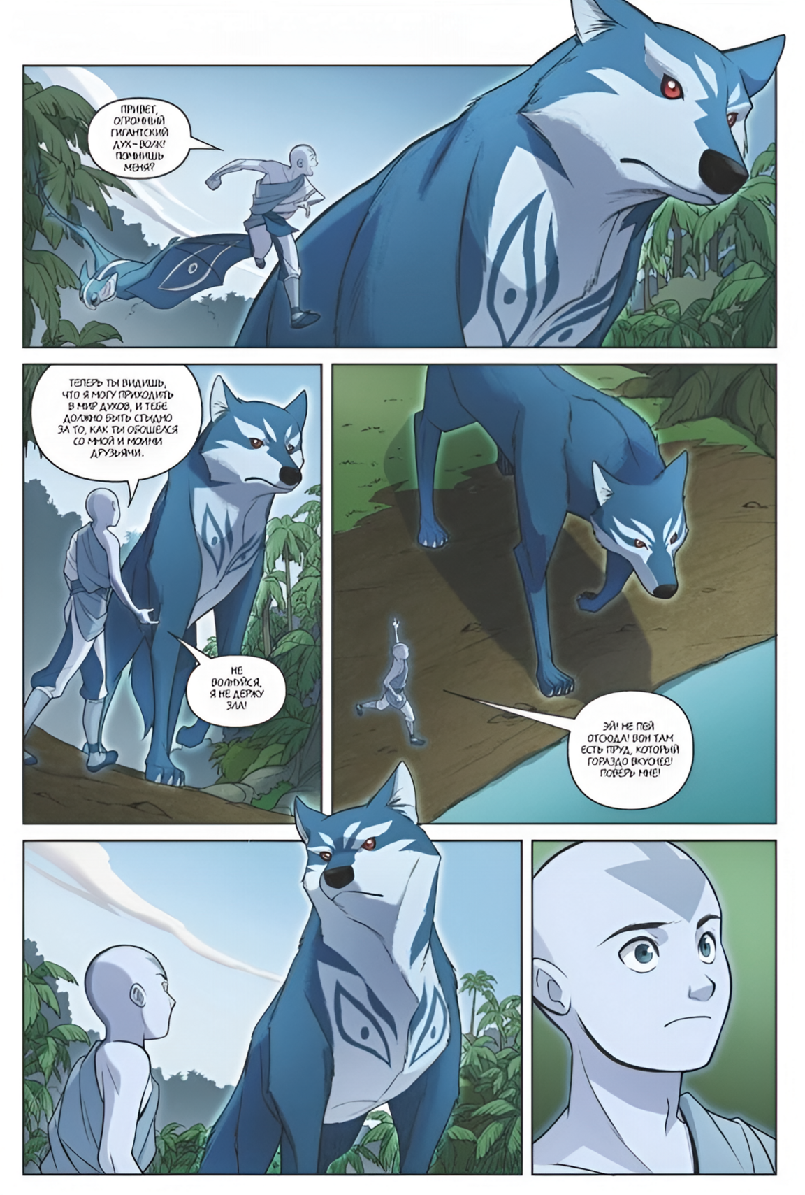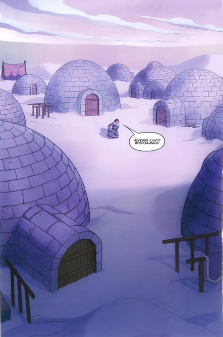 Конечно же, самая первая полоса истории, которая выпустилась сразу после анимационного сериала, начинается так. Зрители привыкли к тому, что каждая серия начинается с заставки-предисловия, где рассказывают о четырех племенах и о том, как они друг с другом взаимодействуют. Поэтому, видимо, чтобы привлечь зрителей читать после сериала комиксы, самая первая книга начинается с привычной нам картинкой.