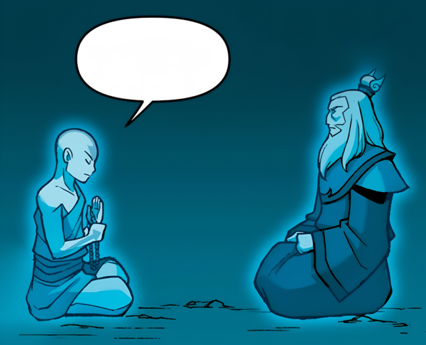 По моим наблюдениям, есть два признака, что Аанг связывается с миром Духов. Либо он входит в «состояние Аватара», то есть его глаза и татуировки подсвечиваются, либо в медитации для связи с предшественниками ему помогают молитвенные бусы, которые используют все воздушные маги.