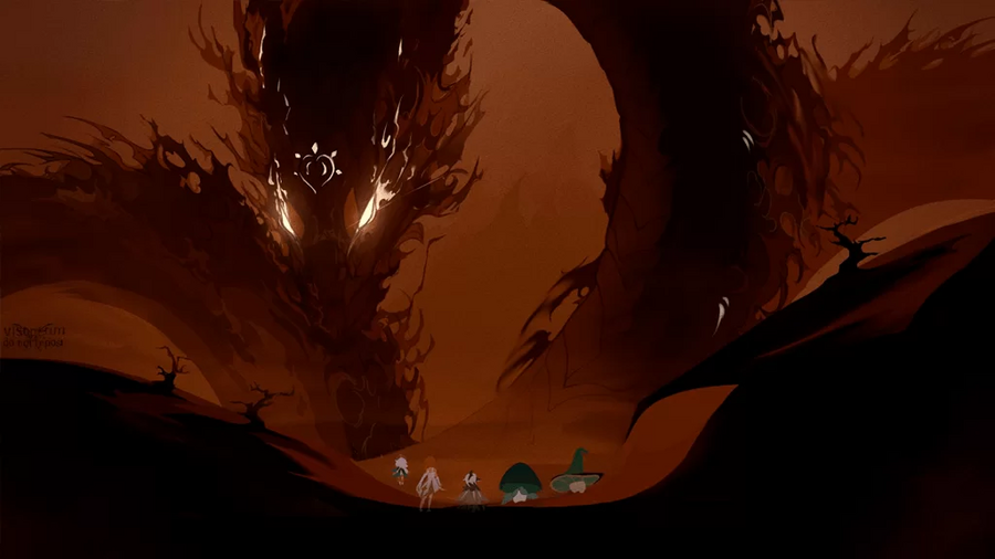 Официальный арт разработчиков Genshin Impact. (Крупным планом изображена Архонт Пиро региона — Натлана)