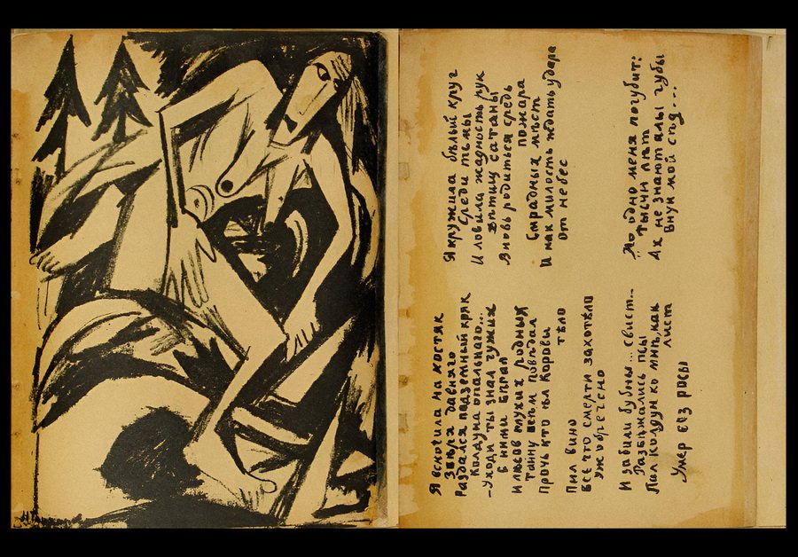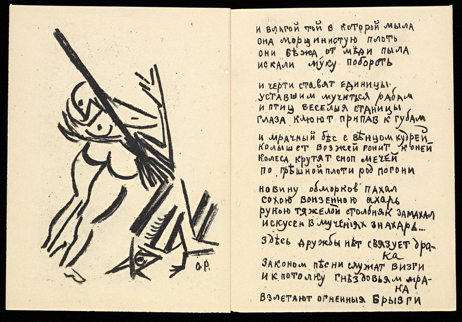 Рукописный текст и иллюстрации — все выполнено в одной технике с помощью литографии. Именно это создавало целостный ансамбль на развороте, все на нем приобретало стилистическую завершенность и законченность, складываясь в единую композицию. Пожалуй, наибольшими поклонниками этого метода были Михаил Ларионов и Наталья Гончарова.
