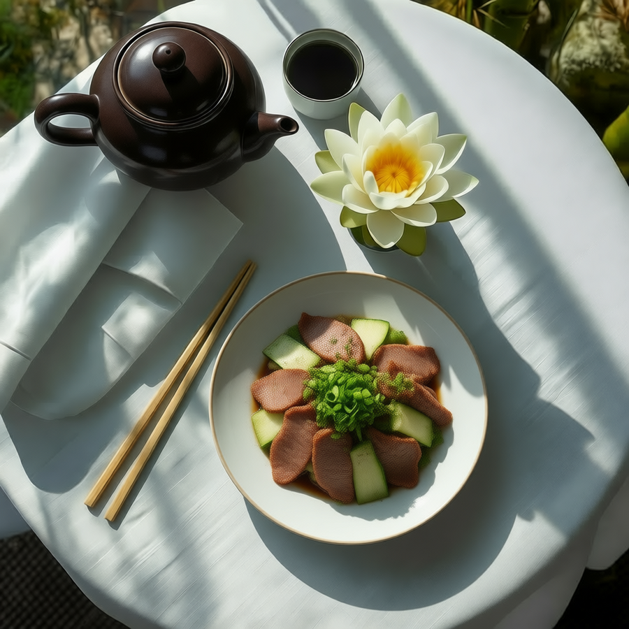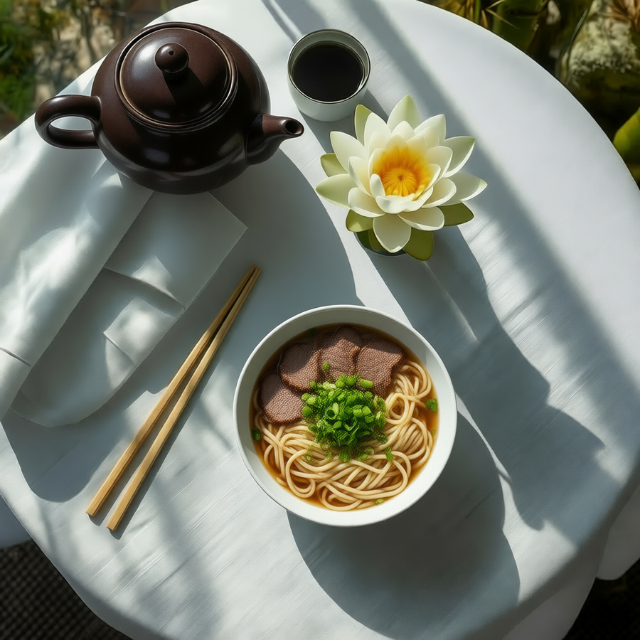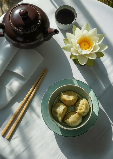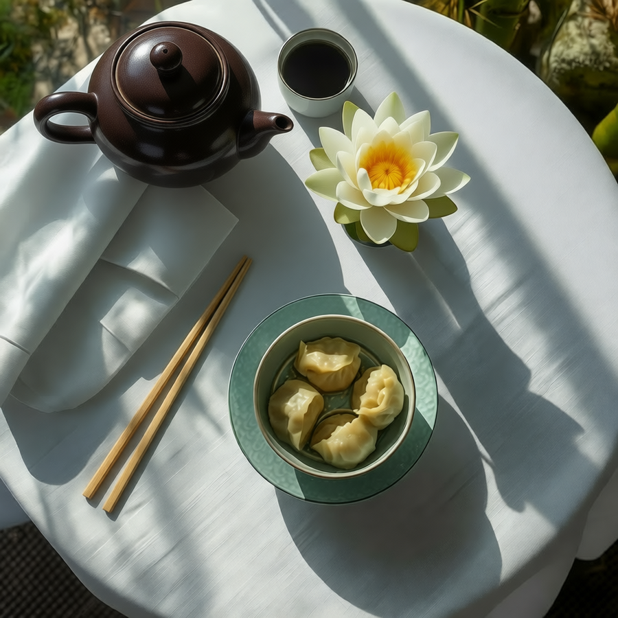 Промт: Hyper-realistic close-up overhead photograph of a dining table set for fine Chinese cuisine in a bamboo forest restaurant. Crisp white linen tablecloth, perfectly arranged celadon porcelain bowl with steaming dumplings, polished silver chopstick rest, and a single red rose in a small vase. Sunlight glints off the porcelain and silverware. Background shows blurred bamboo trunks and moss-covered stones. Shot with macro lens, f/2.8, shallow depth of field, ultra-sharp focus on table setting, rich textures. --ar 1:1 --v 6.0 --style raw