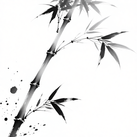 Промт 1: A minimalist black and white ink wash painting of a single bamboo stalk with delicate leaves, set against a stark white background. The composition features expressive brushstrokes and intentional ink splatters, capturing the essence of traditional East Asian sumi-e art.