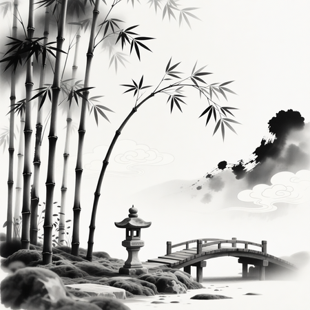 Промт 2: A serene, monochromatic Japanese garden scene rendered in an ink wash style. Tall, slender bamboo trees frame the view, leading to a small stone lantern and a gracefully arched wooden bridge over calm water. Misty mountains and soft clouds drift in the background, evoking a tranquil, contemplative atmosphere.