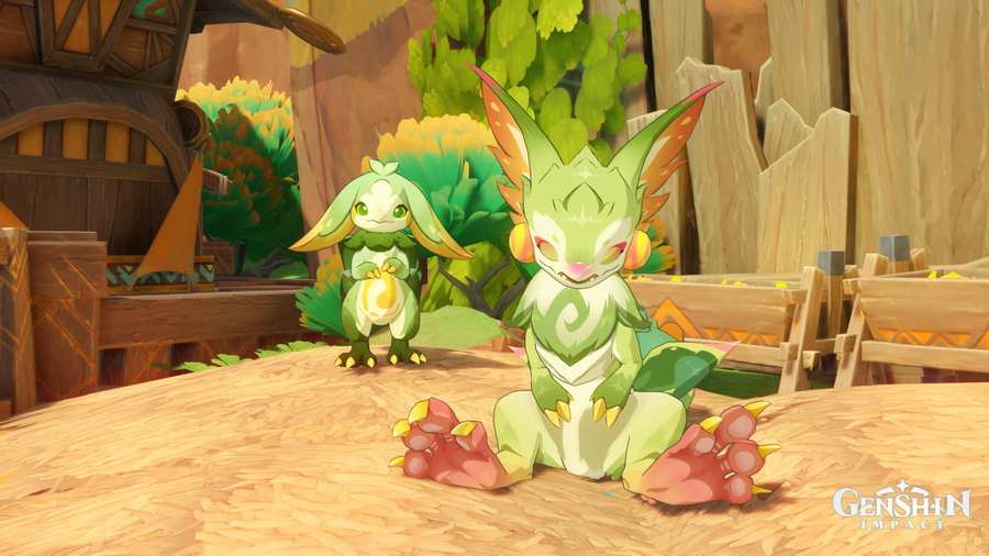 Юмказавр со своим детёнышем; Genshin Impact — скриншот из игры