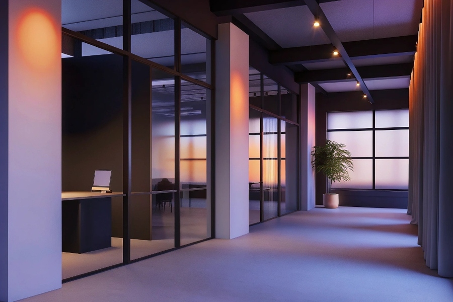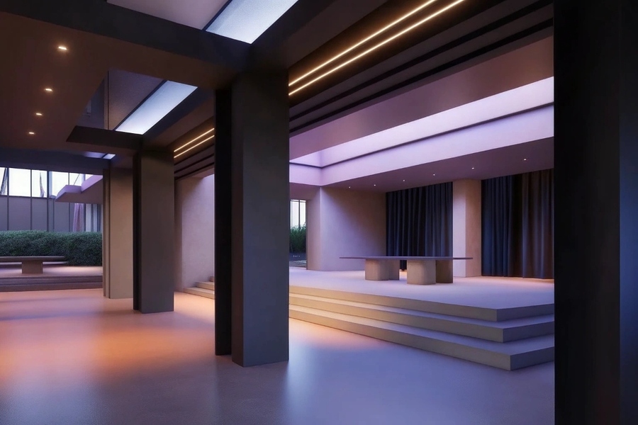 promt: interior concept for «zlockey notes» — a minimalist architectural bureau identity translated into space design. style: contemporary minimalism with architectural precision and artistic atmosphere. space should reflect the essence of the brand: clarity, structure, and subtle emotional depth